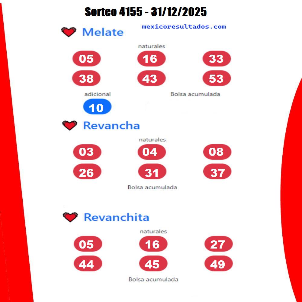 Consulta los resultados completos del sorteo Melate número 4155 y verifica si tus números fueron los ganadores. Aquí te ofrecemos un desglose detallado del sorteo, incluyendo premios y combinaciones. No te pierdas ni un detalle de este evento y comprueba si eres uno de los afortunados ganadores de esta edición del Melate realizada el miércoles, 31 de diciembre de 2025